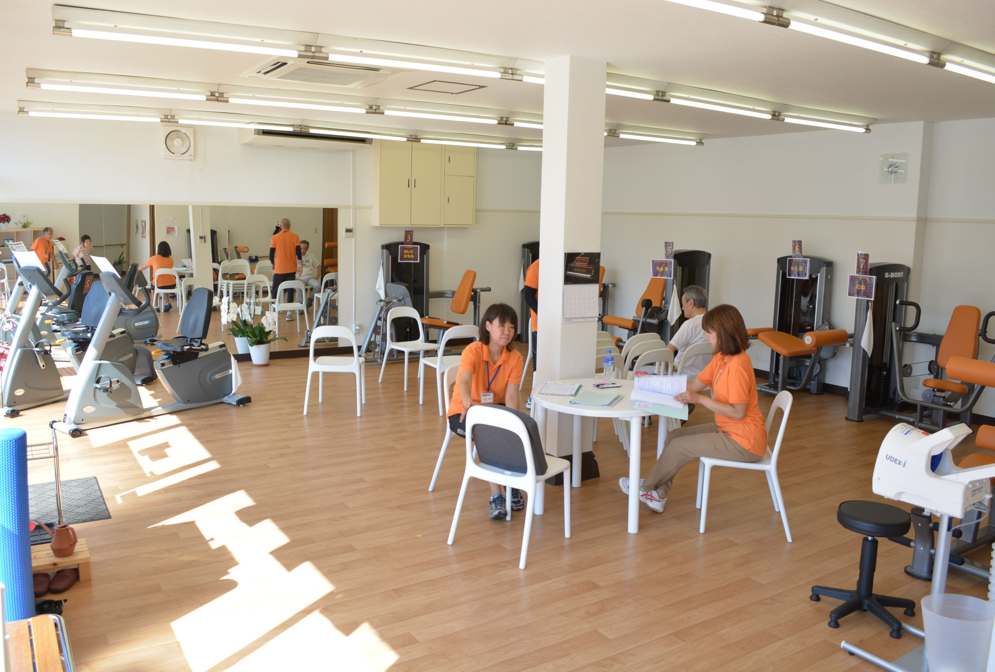 ケアフルクラブ・ジム フローラのトレーニングルームには10台のトレーニングマシーンと平行棒の他、チューブローイングのための器具や、握力を鍛えるグリップやバランスボール、ストレッチ器具等を揃えています。